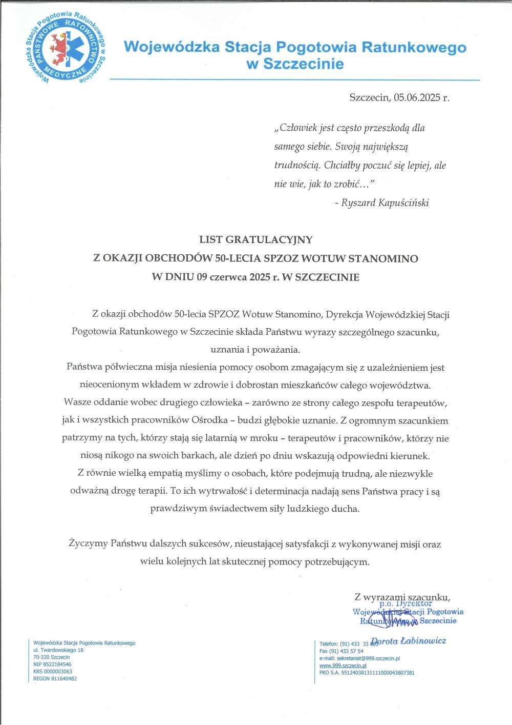 Nie każdego dnia ma się okazję podziękować za to, co otrzymało się od innych. Bardzo dziękuje Wszystkim za życzenia z okazji Naszego Jubileuszu. Andrzej Sajewski Dyrektor SPZOZ WOTUW Stanomino